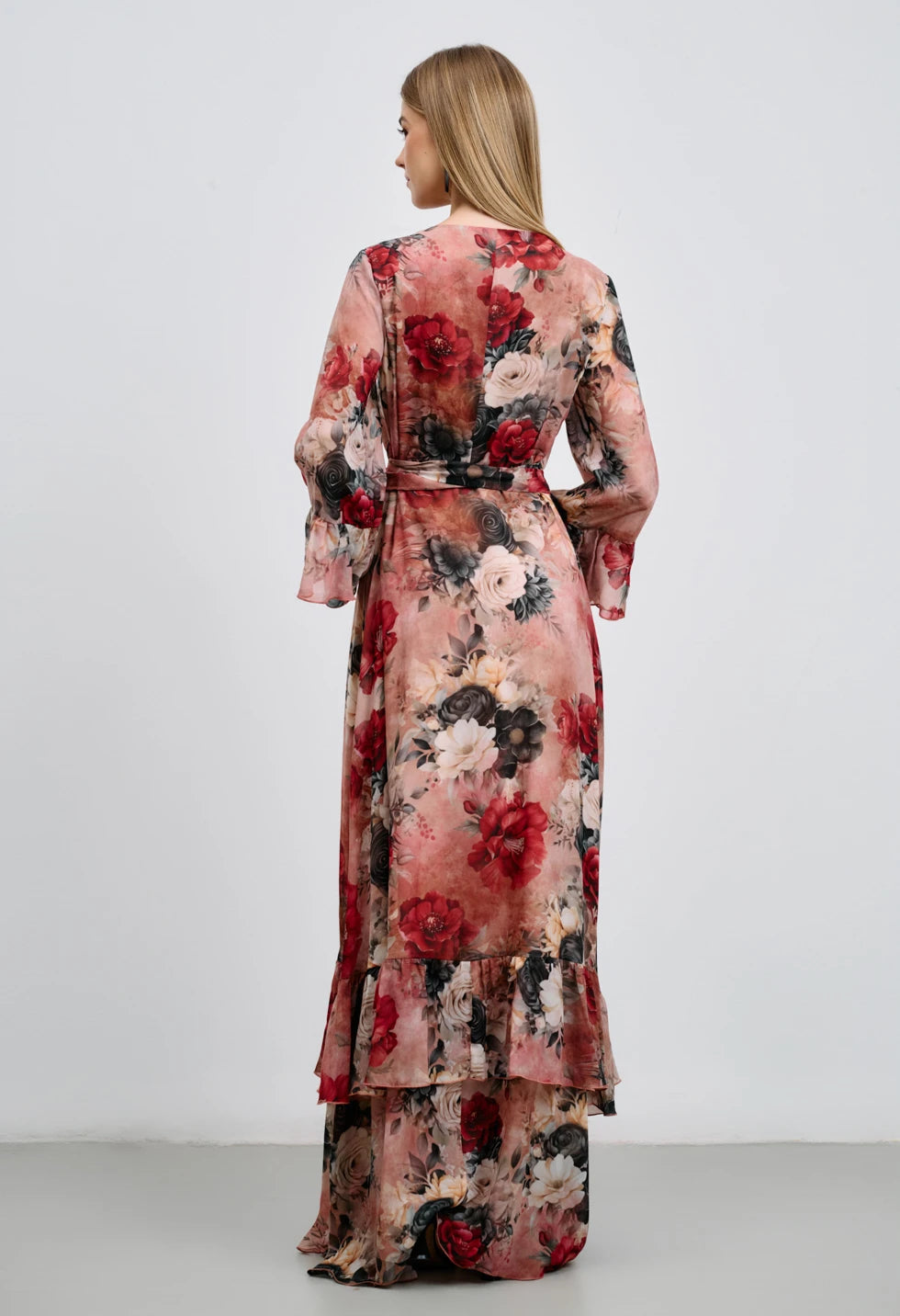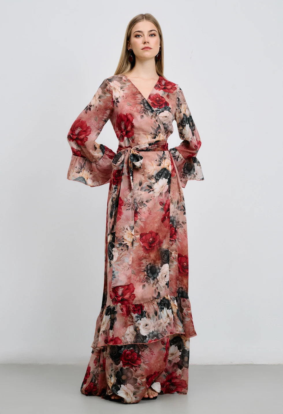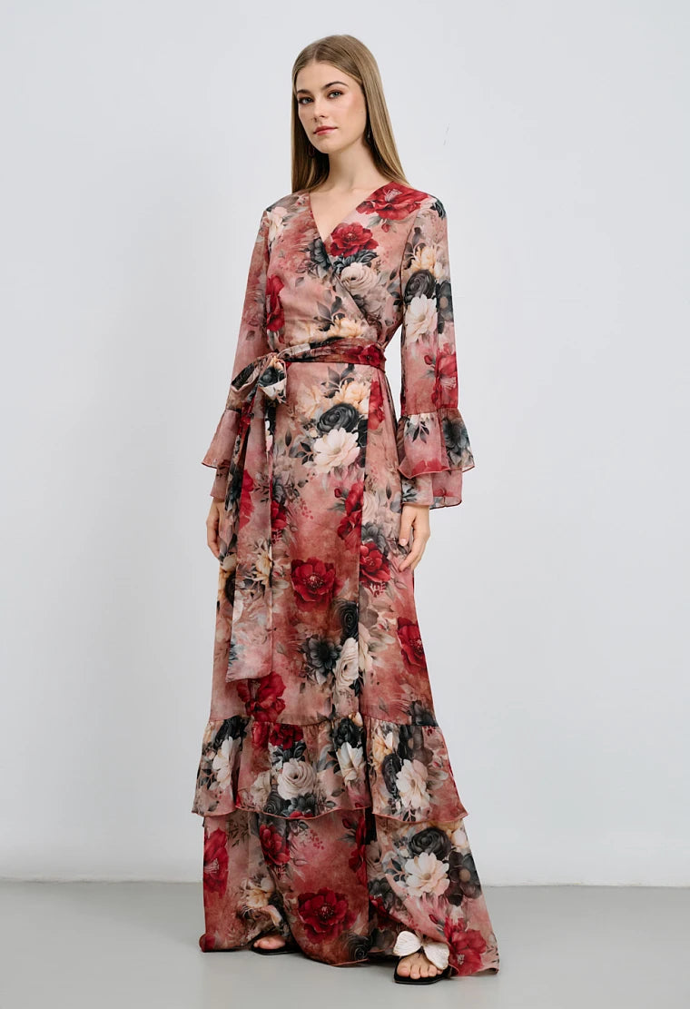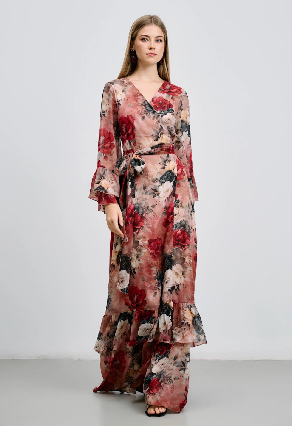 Printed wrap dress with a V-neckline, long sleeves with ruffled cuffs, crossover closure with belt, double ruffle hem, regular fit.