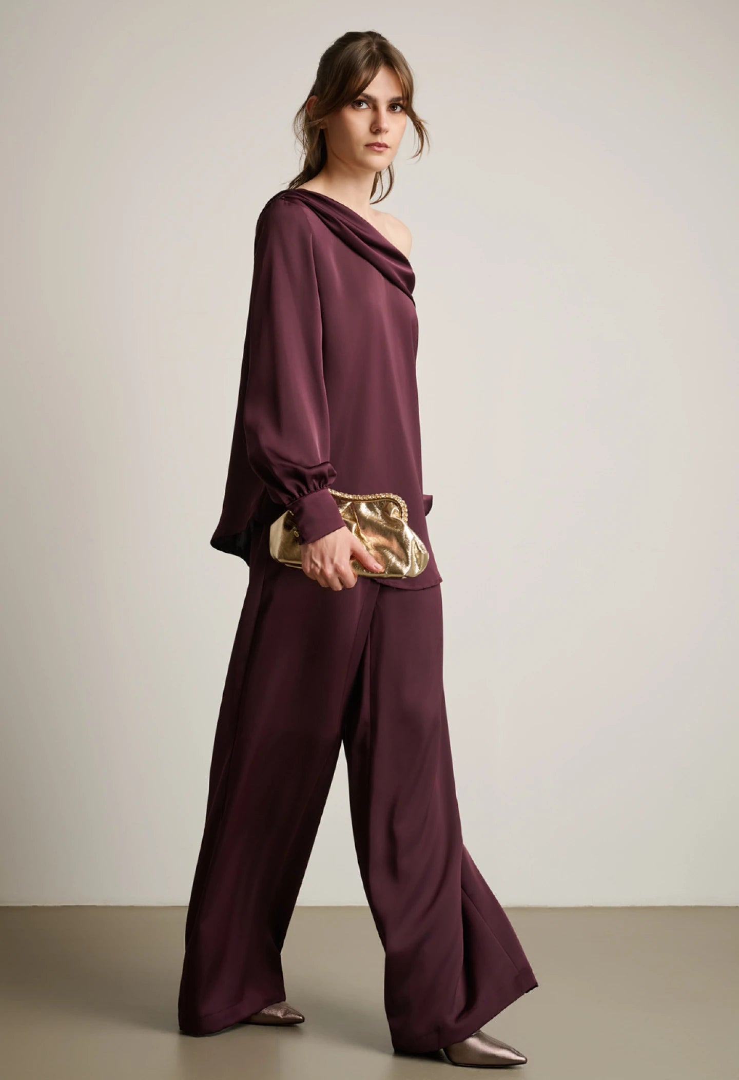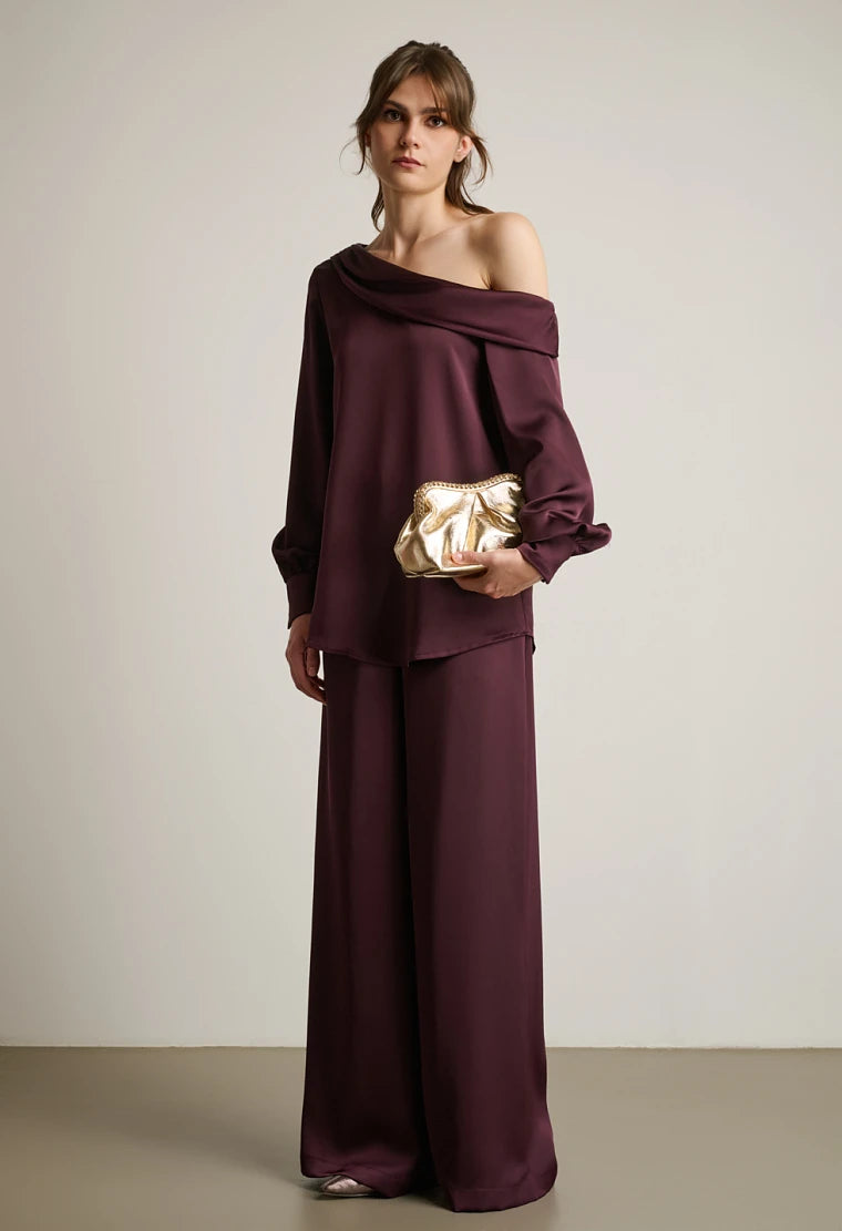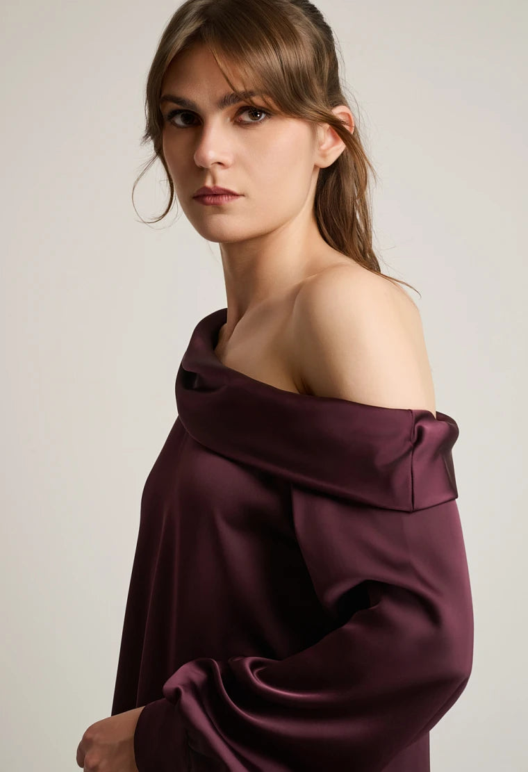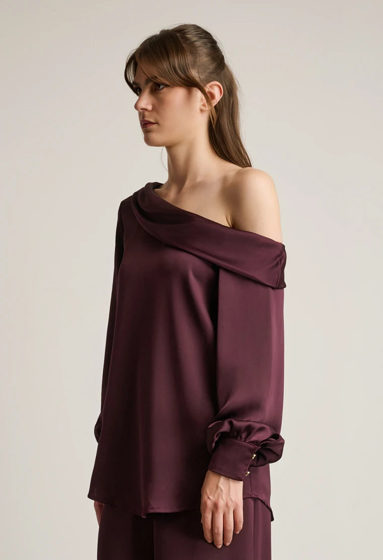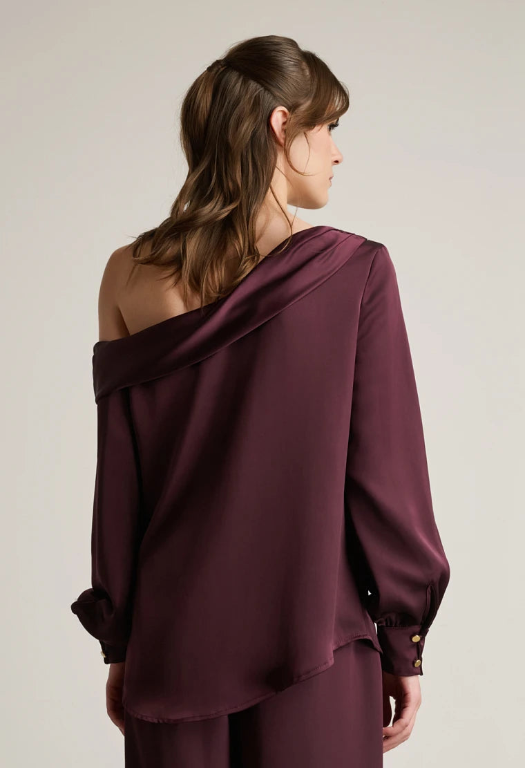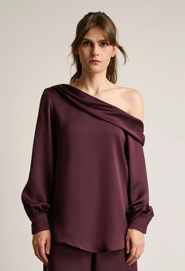 One-shoulder satin blouse, asymmetric design, long sleeves with cuffed ends.
